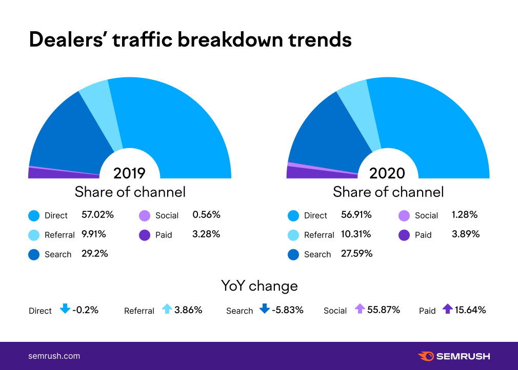 For example, here’s one infographic from our Marketing Strategy Hub that breaks down web traffic channels for car dealerships using pie charts: