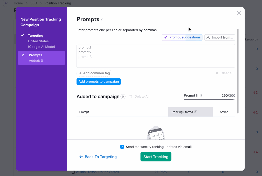 Next, add the keywords you want to track in Google AI Mode. You can add prompts manually, from a file, or from Semrush’s prompt suggestions.