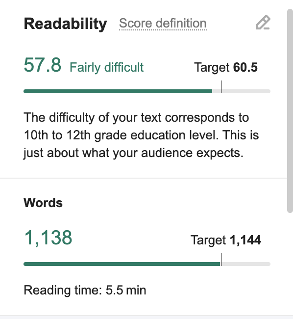 - Click on the ‘Readability’ button. Check the target readability for your article and compare the figure to your current readability. The higher the score, the easier the language should be. Click on the ‘Score definition’ to learn how the score works.