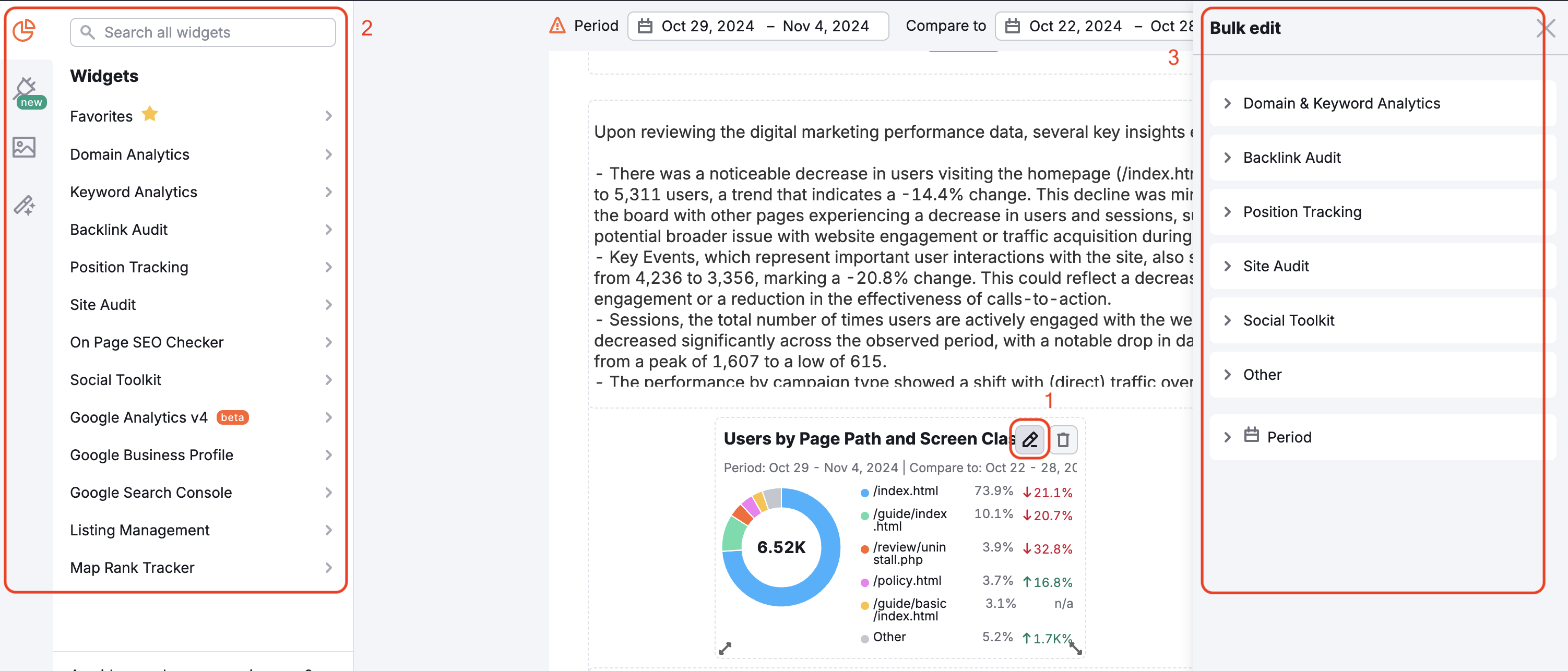 Now you’re all set! If you feel that something needs to be changed at this point, feel free to customize your reports and delete or edit the existing widgets (1), add new ones (2), or use the Bulk Edit feature (3) to manipulate multiple datasets at once.