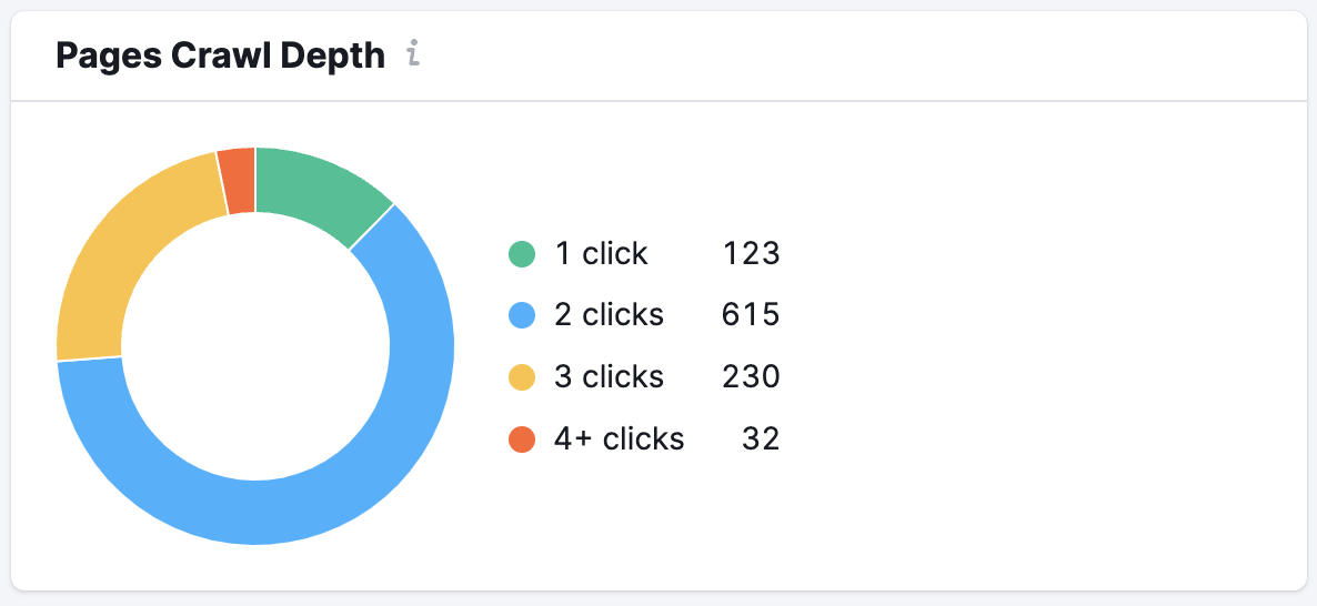 Then you will see a chart showing the Pages Crawl Depth. The number of clicks in the Pages Crawl Depth chart refers to how many clicks the crawler had to make on your site to reach each page during the crawl. With a lower crawl depth, it’s easier for a web crawler to find the content on your website. With a crawl depth of 4+, there is a possibility that a user or bot won’t even reach the page.