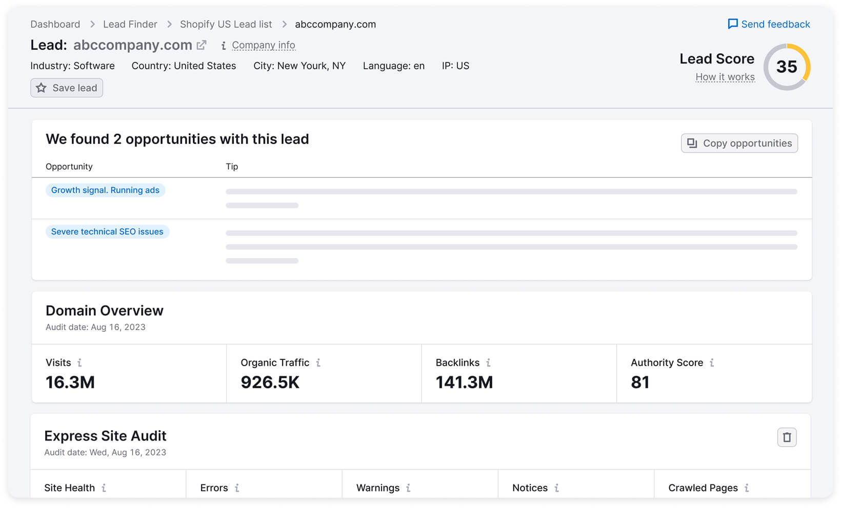 Easily narrow down the list of prospects based on the Semrush Lead Score and the SEO metrics that matter to you.